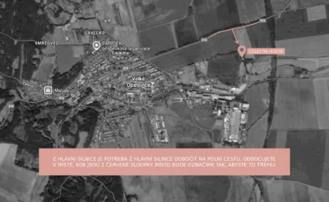 Místo se nachází na pomezí Jihomoravského, Pardubického a Olomouckého kraje. Autem se tam dostanete přibližně za 60 minut z Brna a Olomouce. Cesta je velmi snadná i z bližších měst – Celestia House leží cca 15 minut od Letovic a 20 minut od Boskovic.